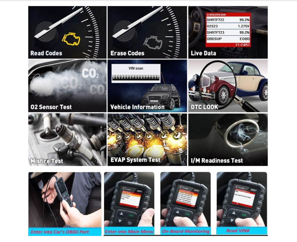 • Full OBD-II Functions: Includes I/M readiness, O2 sensor test, EVAP system test, and more.